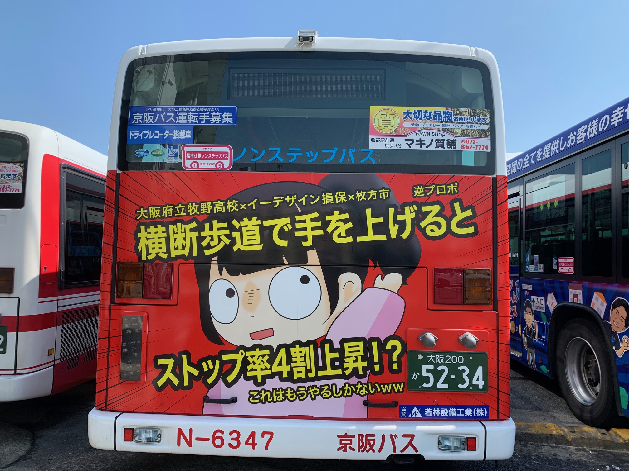 デザインしたプリントシートをバスの後部に貼ります。目につきやすく、1ヶ月から始められる広告です。