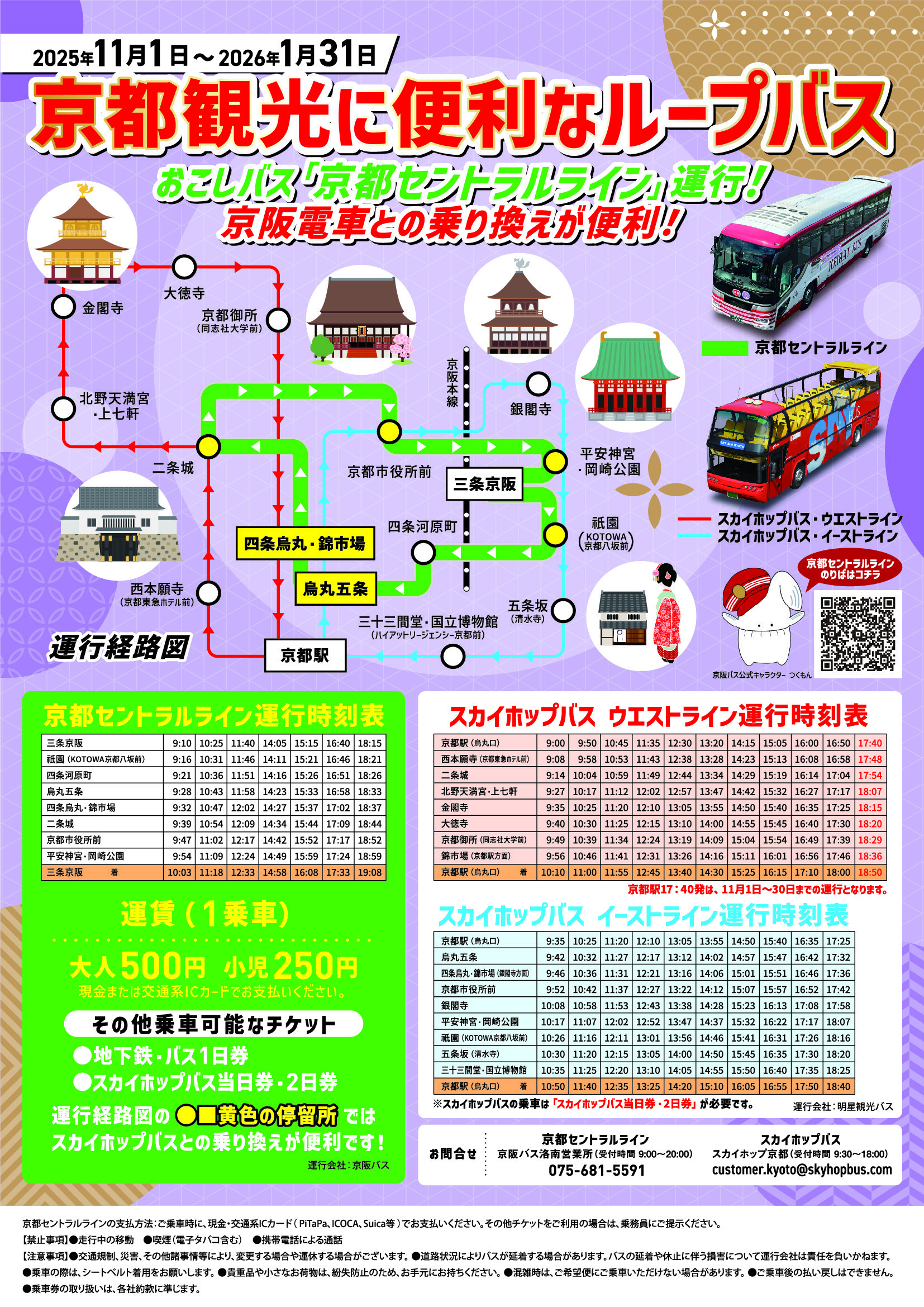 | 内容 | 京阪バス(山科・醍醐地区および市内中心部。一部路線除く)、京都バス(京都観光フリー区間)、京都市バス・京都市営地下鉄全線、西日本ジェイアールバス(均一運賃区間内)が1日乗り放題! |